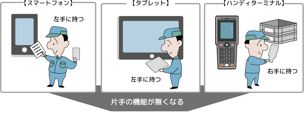ハンディターミナルでは読み取り作業と製造・物流作業を同時に行うことが難しい。