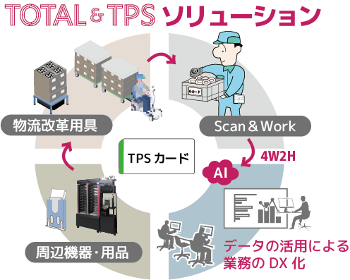 TOTAL(Tool of Turn Around Linkage)&TPS(Transaction Process Scorer)は、「TPSカード」を用いて業務の実績データである「4W2H」をリアルタイムで収集し、モノの動きを情報化して生産と物流領域をDX化するソリューションです。