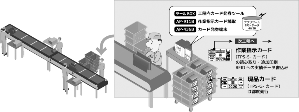 ●作業指示カード(TPS-Sカード)を読み取り、現品カード(TPS-Gカード)を発券