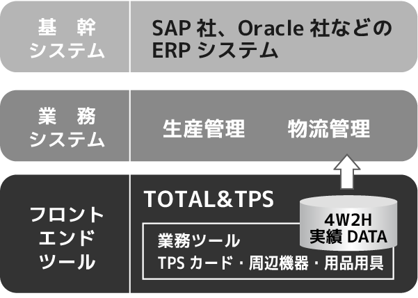 TOTAL&TPSは、基幹システム・業務システムが持つ「計画」に対し、現場の「実績」を(4W2H実績)収集してファイル連携することで現場の「実態」を詳細に分析できるようにします。