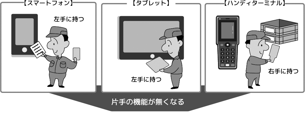 →ハンディターミナルの操作により、片手に伝票を持つと両手の自由を失う
