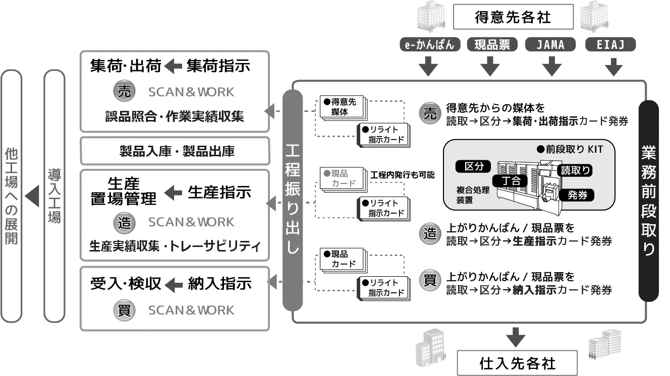 社内の連携: 生産、物流、調達、検査、事務といった複数の部門を横断して情報とプロセスを連携させる。