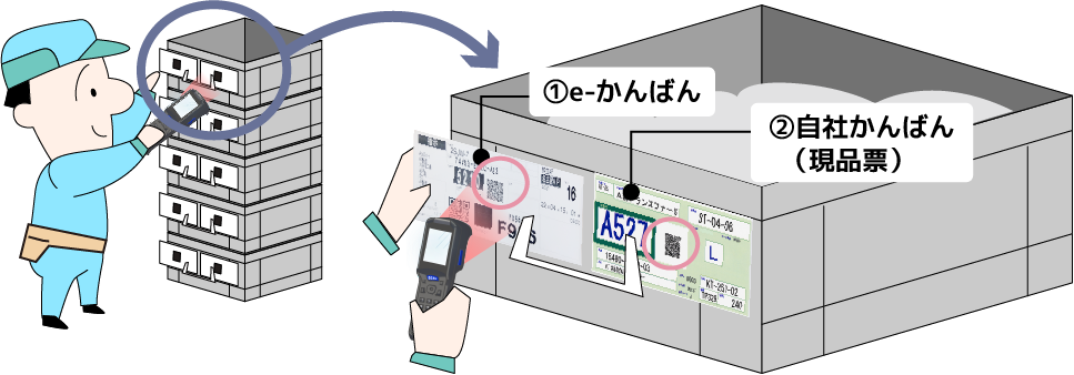 自社かんばん(現品票)の隣にe-かんばんを並べて、ハンディーターミナルなどで①②のQRコードを読み取り照合し、自社かんばんをe-かんばんに差し替え