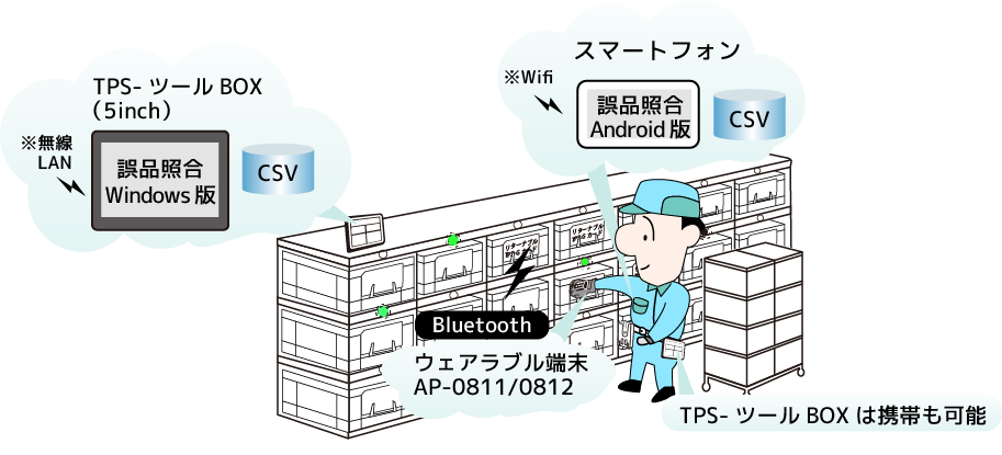 本ツールは、ウェアラブル端末で複数種類の媒体のシンボルまたはRFIDを読み取り照合し、照合した結果と読み取った媒体のデータを実績ファイルへ出力します。