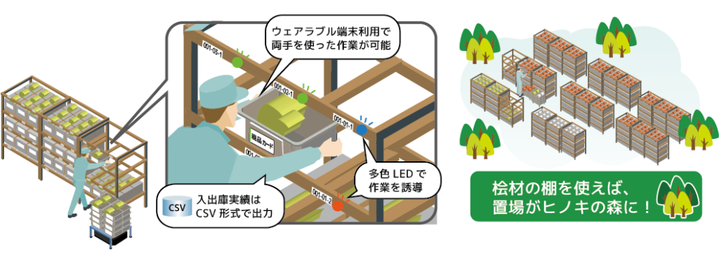 本ツールは、ウェアラブル端末で現品カード(入庫)や指示カード(出庫)を読み取り、保管棚の該当間口のLEDを点灯させて作業をサポートします。
