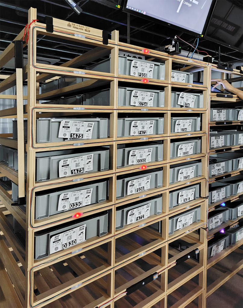作業指示カード(RFID又はQRコード)を読み取り、ピッキング担当者色に点灯したLEDの間口からピッキング。
