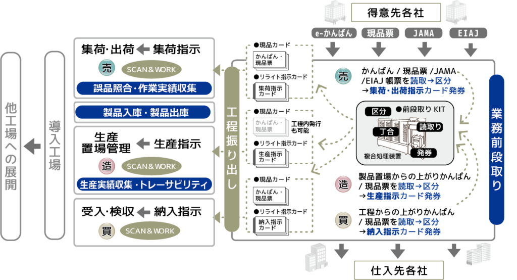 ①発行したe-かんばん(紙かんばん)を読み取り、受注データを後工程別に分類・順序整列して「集約カード」※を発行