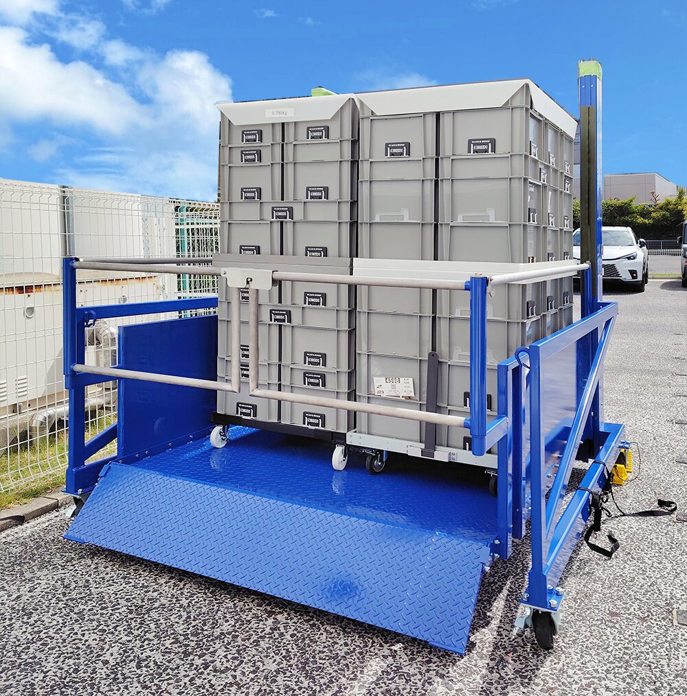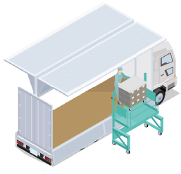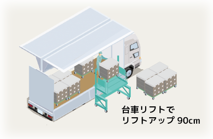 トラックへの積み下ろし場が地面と同じ高さの場合は、TP-台車リフトを使います。