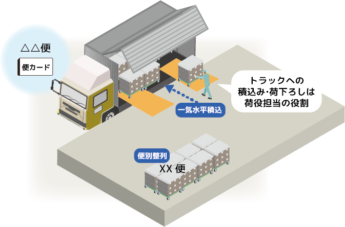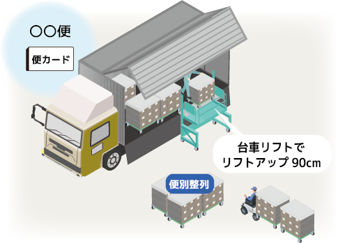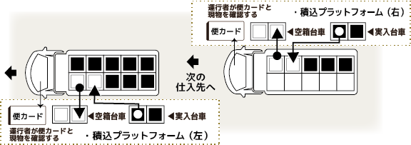 ・便別に空箱を積んだ台車を積み込み、仕入先各社へ